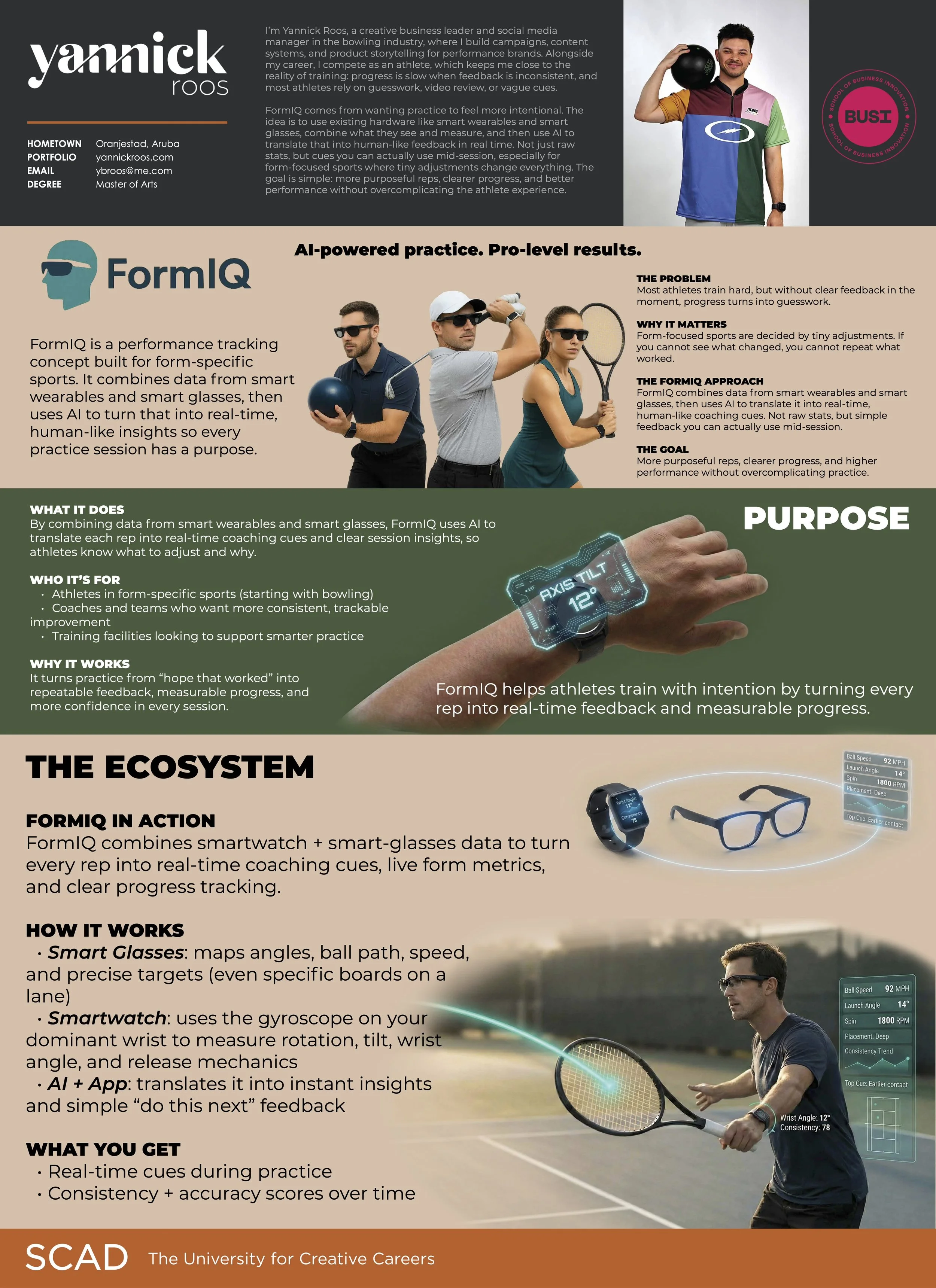 FormIQ is an AI-powered performance platform that combines smart glasses and wearable motion data to help athletes understand and improve their movement through simple, real-time feedback. Designed as a human-centered alternative to complex performance analytics, the system translates biomechanics into clear insights that help athletes build consistency, track progress, and improve across multiple sports.